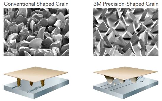 To create 3M Precision Shaped Grain, our design engineers started with 3M™ Ceramic Abrasive Grain and used proprietary technology to form the grains into triangular structures and electrostatically orient them on the backing to form sharp peaks that maximize cutting potential. These peaks slice cleanly through metal like a knife through butter, rather than gouging or plowing as traditional abrasives do, and continuously self-sharpen as the points break off. This generates a super-fast cut and lessens heat build-up due to friction, reducing heat-related stress cracks and discoloration. 3M Precision Shaped Grain also wears evenly, and because the abrasive itself stays cooler and sharper, 3M™ Cubitron™ II products last significantly longer than their conventional ceramic counterparts, ensuring extended high performance in production applications.